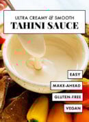 Learn how to make ultra creamy tahini sauce! The best tahini sauce is ultra creamy, deliciously tangy and irresistible. This recipe is easy to make, too. You’ll just need a whisk! Recipe yields 1 to 1 ¼ cup; double if desired.