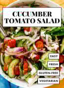 When itโs blazing hot outside, this cucumber tomato salad is exactly what I want to eat. This recipe is crisp and refreshing, light yet satisfying. Itโs the perfect side dish to make with a surplus of cucumbers and tomatoes from your garden or farmersโ market.