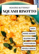 This butternut risotto recipe is comforting, yet redeeming, and absolutely delicious. It features tender, caramelized cubes of butternut squash throughout.