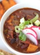 Extraordinary vegetarian chili containing sweet potatoes, black and kidney beans, peppers and cocoa powder. A wonderfully delicious, hearty & healthy vegan meal. Recipe yields 6 bowls.
