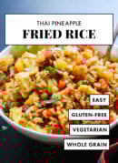 Thai-style sweet and spicy pineapple fried rice with red bell pepper, cashews and cilantro. This is a healthy and quick, vegetarian weeknight dinner! This dish comes together very quickly, so be sure to have your ingredients (including chilled leftover rice) prepped in advance. Recipe yields 2 large, restaurant-sized portions or 4 more modest portions.
