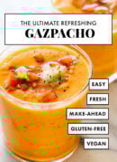 This gazpacho recipe is the best! It’s a refreshing chilled summer soup, perfect for your garden tomatoes and cucumber. Be sure to make it in advance so the soup can chill for at least 2 hours. Recipe yields 5 cups, enough for 4 servings.